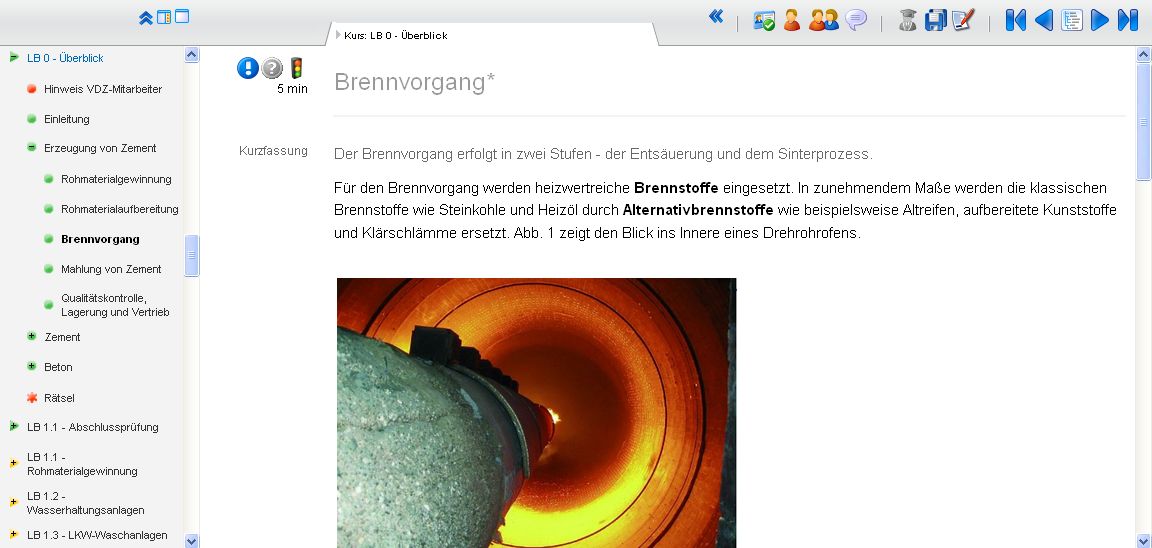 Die o.g. Themen werden in circa 50 Kursen umfassend behandelt. In Summe beträgt die Lernzeit im Bereich Zement derzeit ca. 100 h Lernstunden.