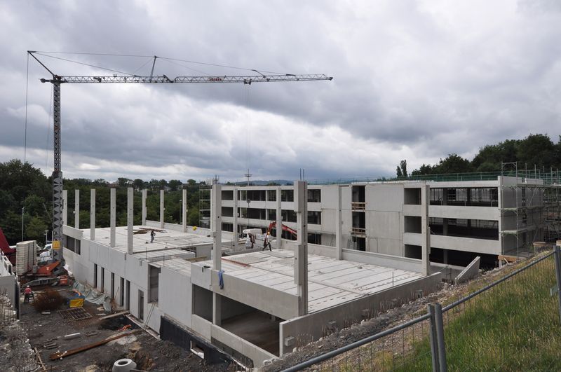 Auch das Seminargebäude wurde größtenteils aus Beton-Fertigteilen gebaut. Nur der Kellerbereich – hier befindet sich die Haustechnik des Gebäudekomplexes – wurde mit Ortbeton umgesetzt. Die Bauarbeiten laufen nach Plan. Und schon in wenigen Monaten hat die Fern-Universität Hagen eine neue, weithin sichtbare Landmarke – und mehr Platz für Forschung und Lehre.