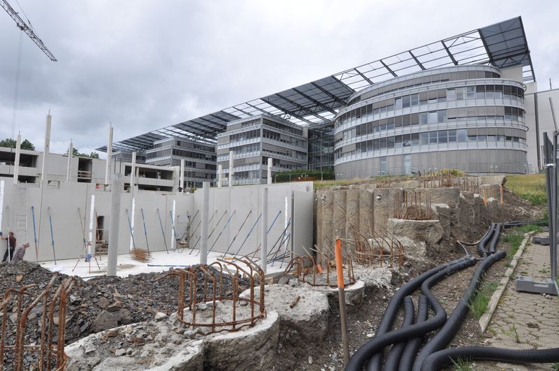 Bevor mit dem Bau der Gebäude begonnen werden konnte, musste das Gelände zunächst aufwendig für die Baumaßnahme vorbereitet werden. Zur Abstützung des Hangs sowie des oberhalb verorteten TGZ setzte eine Arbeitsgemeinschaft von Bauer Spezialtiefbau GmbH (Essen) und Gebr. Schmidt GmbH & Co. KG (Kirchen-Freusburg) zunächst Dutzende bis zu 16 Meter lange Bohrpfahlwände in die Erde. Dabei wurden mit Spezialbaggern zunächst ein Bohrloch erstellt und die Erdmasse daraus entfernt.