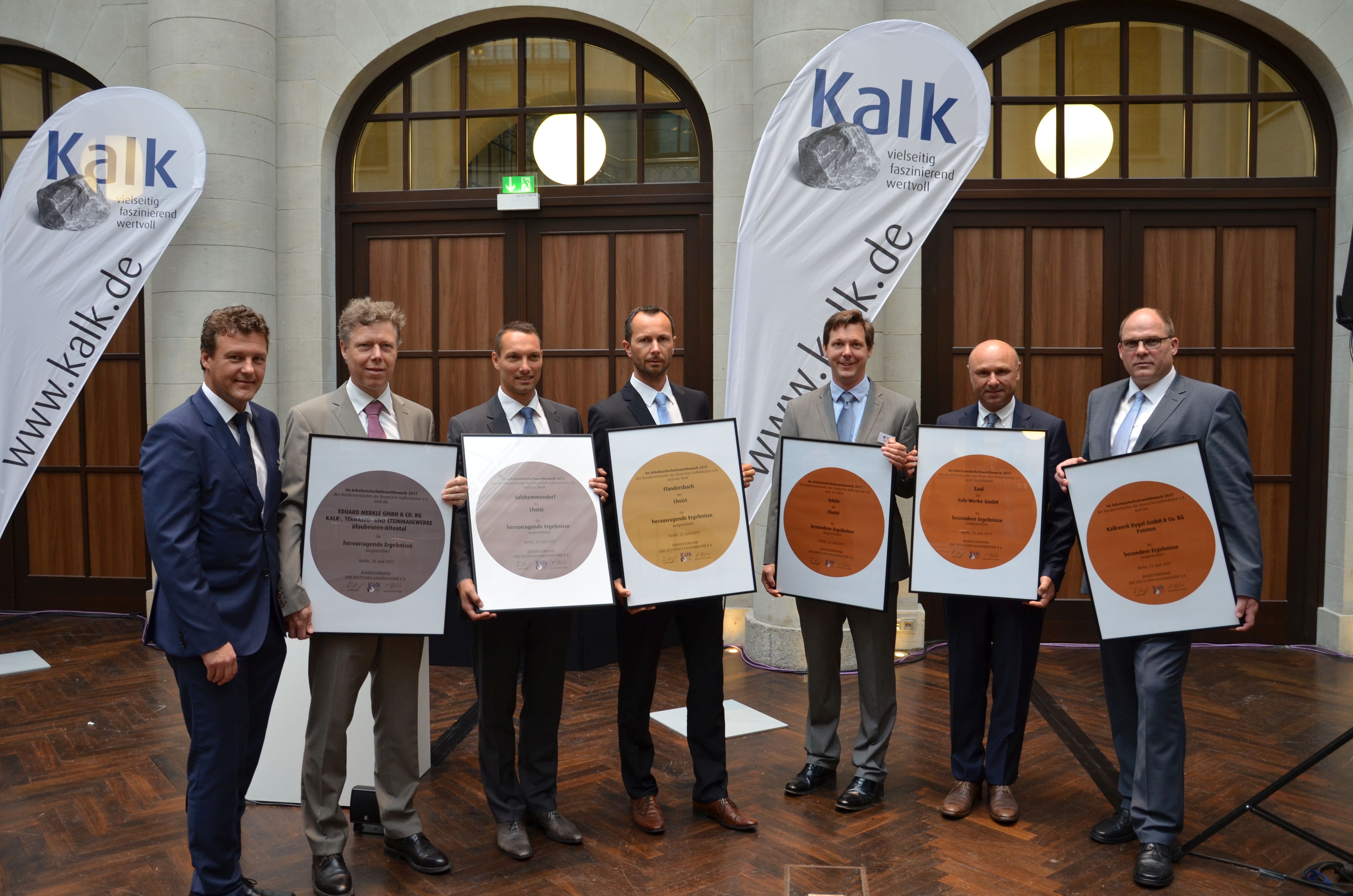 „Arbeitsschutz ist kein einmaliges Unternehmensziel, sondern ist vielmehr Daueraufgabe“, so Dr. Schaefer. Anschließend nennt er die Betriebe, die in 2016 unfallfrei waren und gibt die Gewinner des Arbeitssicherheitswettbewerbs 2017 bekannt. Die Urkunde in Gold erhält das Werk Flandersbach der Lhoist Germany Rheinkalk GmbH.