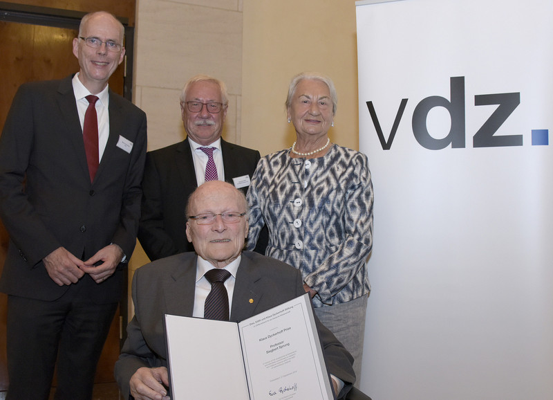 Ein weiterer Höhepunkt war die Verleihung des 5. Klaus-Dyckerhoff-Preises an Prof. Dr.-Ing. Siegbert Sprung. Die Auszeichnung wird von der Dyckerhoff-Stiftung verliehen, um besondere Verdienste auf dem Gebiet der Zementherstellung und -anwendung zu ehren. Der Dyckerhoff-Preis gehört heute zu den anerkanntesten, internationalen Preisen in diesem Bereich. Laudator und VDZ-Hauptgeschäftsführer Dr. Martin Schneider betonte die herausragende Bedeutung des Wirkens von Siegbert Sprung: „Vieles von dem, was wir heute über Zement und seine Eigenschaften wissen, haben wir seinen Arbeiten zu verdanken“, so Schneider.